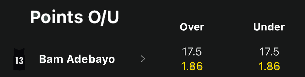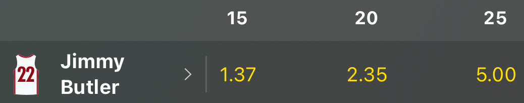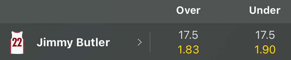 It is common for player props to only have the 'over' option. In this case you can bet on Jimmy Butler scoring 15 or more points (over 14.5 points), 20 or more points (over 19.5 points) and 25 or more points (over 24.5 points).