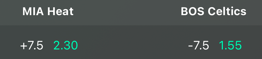 In this handicap market, Miami Heat has a +7.5 handicap, meaning the bet wins if they either win the game outright or lose by 7 points or fewer. The Boston Celtics have a -7.5 handicap, requiring them to win by at least 8 points for the bet to win.