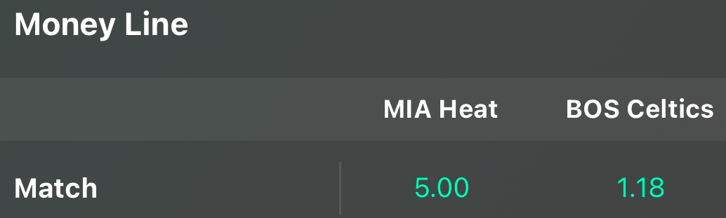 On this market there are two options; Miami Heat to win or Boston Celtics to win, giving us 2 different outcomes.