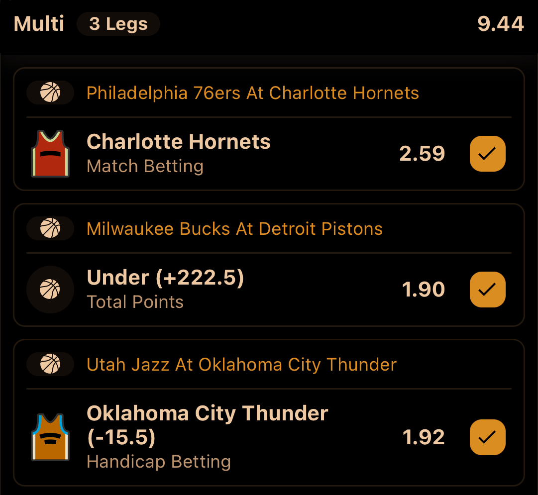 In the multi bet example above, we’ve combined bets from three different games into a single wager. Each selection, or leg, has its own individual odds, and when combined, the odds are multiplied to create a higher total—9.44 odds in this case. This higher payout reflects the increased risk of needing all legs to win for the multi to succeed. For a multi bet involving different games, the total odds are calculated by multiplying the individual odds of each selection. For example, in this case: 2.59 × 1.90 × 1.92 = 9.44. This total represents the combined odds of all selections winning.