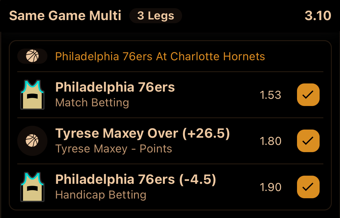 Let’s consider an example: You create a same game multi combining Philadelphia 76ers to win and Tyrese Maxey to score 40+ points.