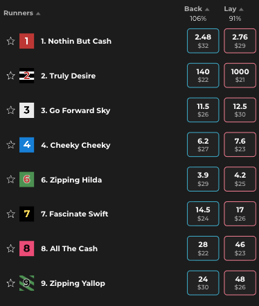 This is the simpler of the two. Open the race page – Click the bookmaker logo next to the bet in RaceWise to be taken directly to the race. Wait until it's close to the race start time – The closer to jump, the more accurate Betfair prices become. This is when the market has likely priced in any late changes, reducing variance. Place your bet – If a bet meets your minimum EV (we recommend at least $5) and the odds are within your preferred range (lower odds help reduce variance), go ahead and place the bet. Once placed: