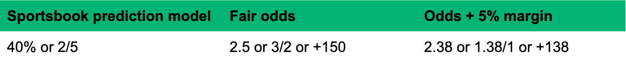 Staking $100 would result in a profit of $150 ($250 payout) for the fair odds compared with a profit of $138 ($238 payout) for the odds with bookmaker margin.