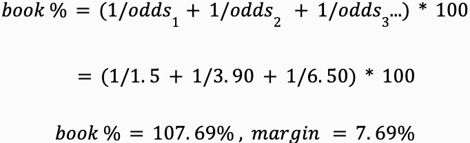 We have calculated the bookmaker percentage to be 105.34% for these outcomes. The sportsbook margin is simply the extra percentage over 100% - in this case the sportsbook margin is 5.34%. With a proportional amount of money wagered on either side, the sportsbook would pocket 5.34% of the total money.