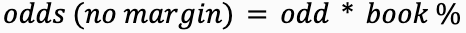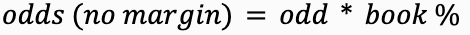 Now that we have calculated the book percentage and sportsbook margin, we can easily remove this margin to find what the odds would be with no margin. To achieve this, simply multiply the original odds by the book percentage.