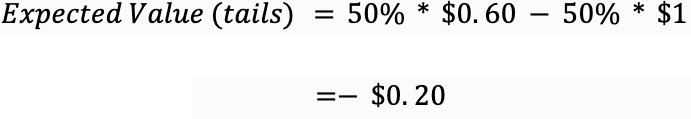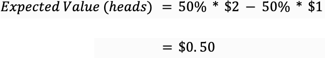 Intuitively we know that the 'heads' option has more value and would choose to bet on it. Breaking it down mathematically using expected value is as follows: