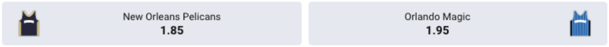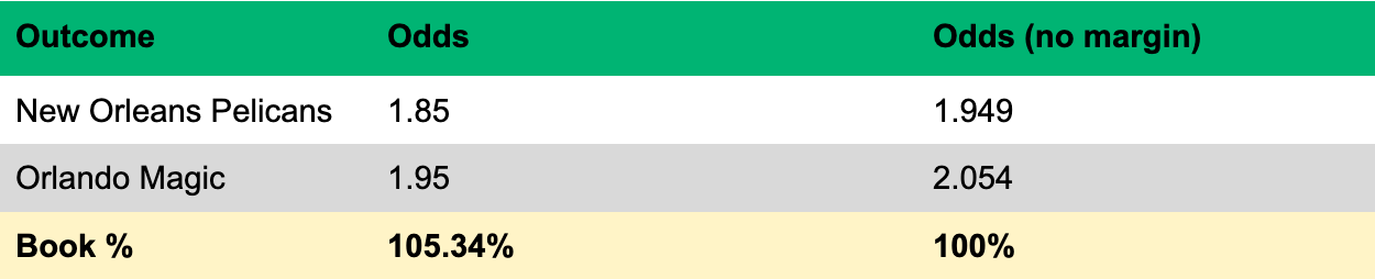 Here we see a bet option for the winner of the match between 'New Orleans Pelicans' and 'Orlando Magic'. In order to calculate the margin, we must first calculate what’s known as the book percentage. This is achieved by summing the implied probability of each outcome and multiplying by 100.