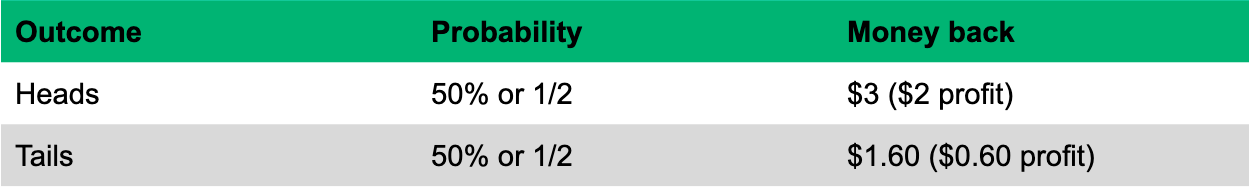 The person offers you $3 back if the coin lands on 'heads' and $1.60 back if the coin lands on 'tails'.