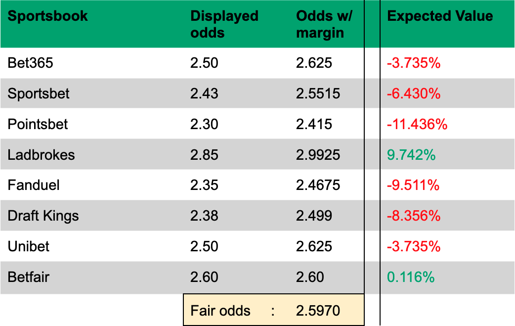 In the example, odds for a particular outcome are compiled from each sportsbook, the margin is removed from the odds and finally an average can be calculated. This average is our best estimate of the fair odds for the outcome. The expected value can be calculated for each sportsbook's odds. We can see Ladbrokes offers a 9.7% expected value bet (2.85 / 2.597).